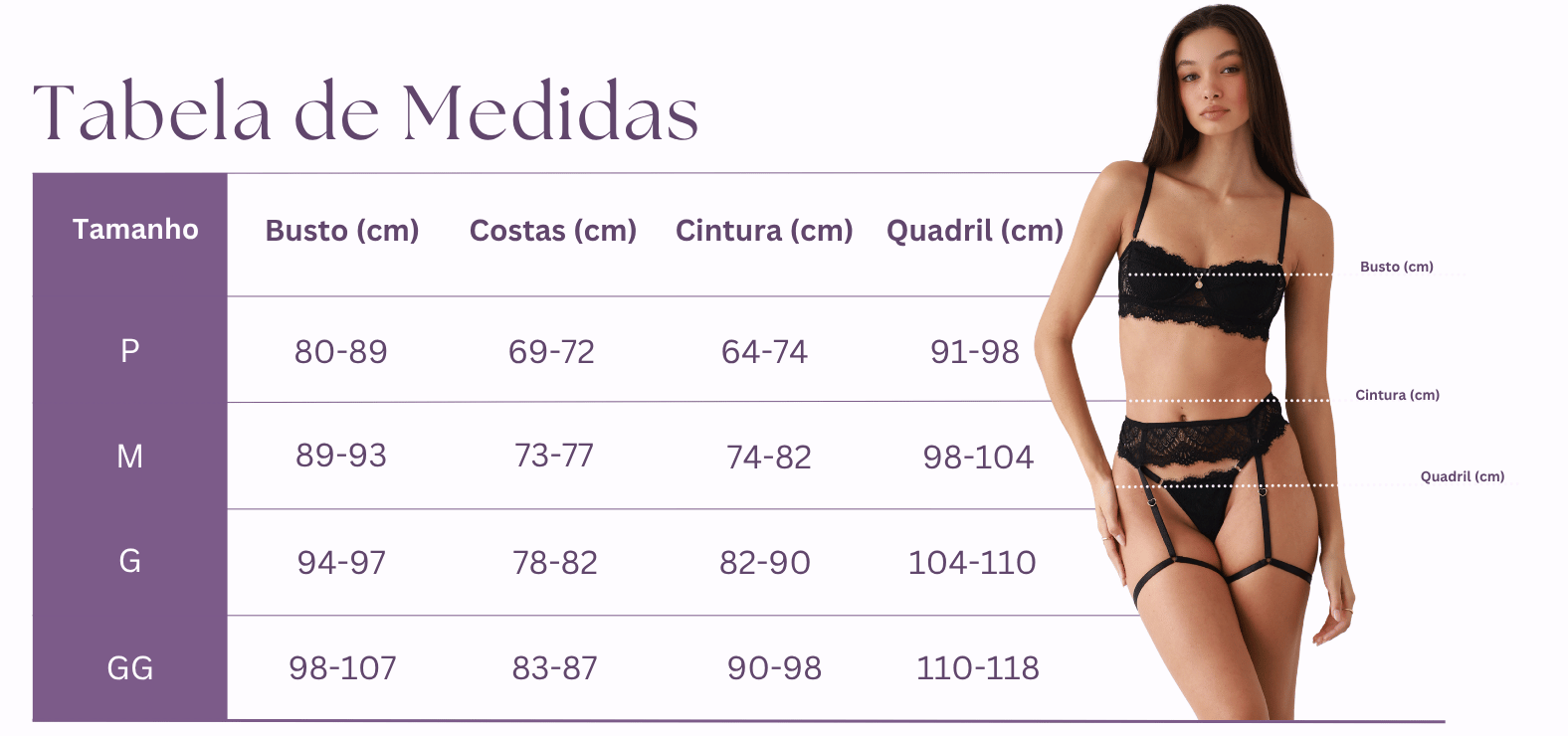 Os tamanhos informados são aproximados, pois os tecidos como renda possuem elasticidade. Se estiver entre dois tamanhos, recomendamos optar pelo maior para garantir mais conforto e melhor caimento.