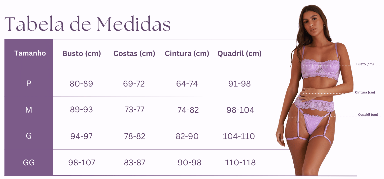 Os tamanhos informados são aproximados, pois os tecidos como renda possuem elasticidade. Se estiver entre dois tamanhos, recomendamos optar pelo maior para garantir mais conforto e melhor caimento.