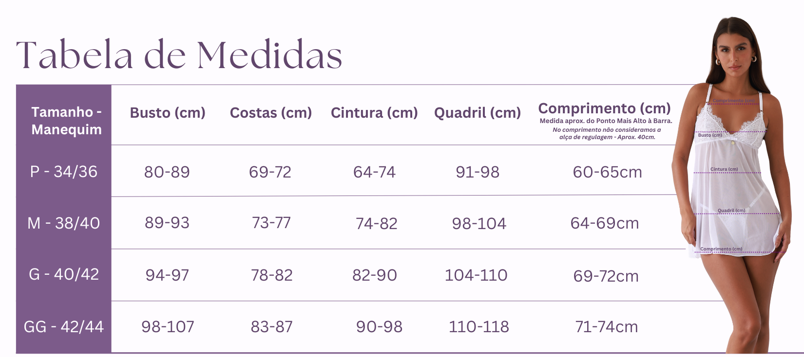 Os tamanhos informados são aproximados, pois os tecidos como renda possuem elasticidade. Se estiver entre dois tamanhos, recomendamos optar pelo maior para garantir mais conforto e melhor caimento.