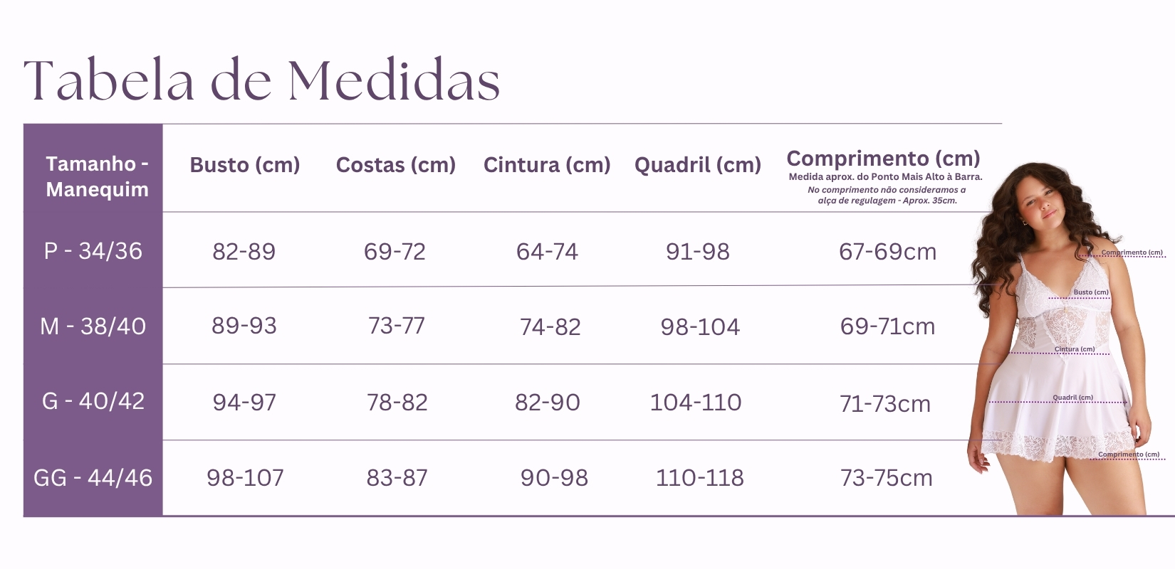 Os tamanhos informados são aproximados, pois os tecidos como poliamida e renda e renda possuem alta elasticidade. Se estiver entre dois tamanhos, recomendamos optar pelo maior para garantir mais conforto e melhor caimento.