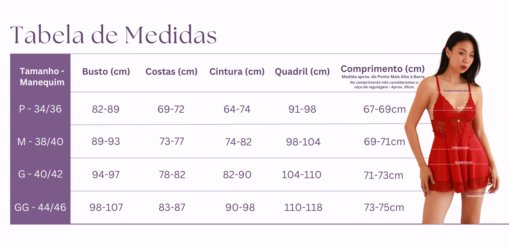 Os tamanhos informados são aproximados, pois os tecidos como poliamida e renda e renda possuem alta elasticidade. Se estiver entre dois tamanhos, recomendamos optar pelo maior para garantir mais conforto e melhor caimento.
