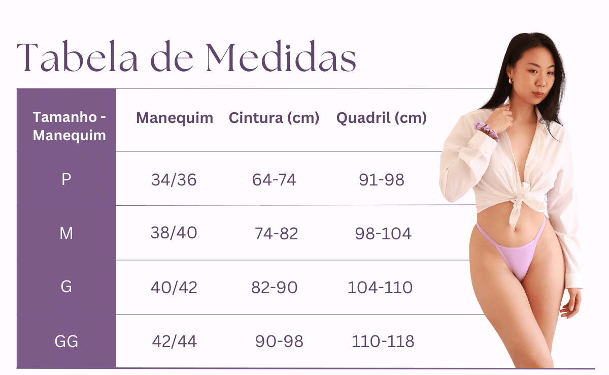 Os tamanhos informados são aproximados, pois os tecidos como a microfibra possui alta elasticidade.