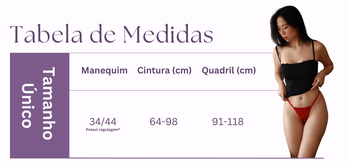 Atenção! Esse modelo de calcinha possui tamanho único. Confira abaixo a tabela de tamanhos: