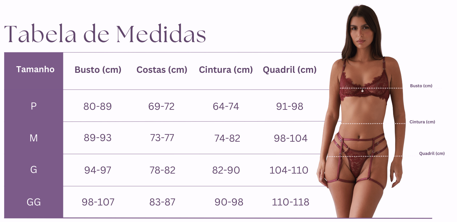 Os tamanhos informados são aproximados, pois os tecidos como renda possuem elasticidade. Se estiver entre dois tamanhos, recomendamos optar pelo maior para garantir mais conforto e melhor caimento.