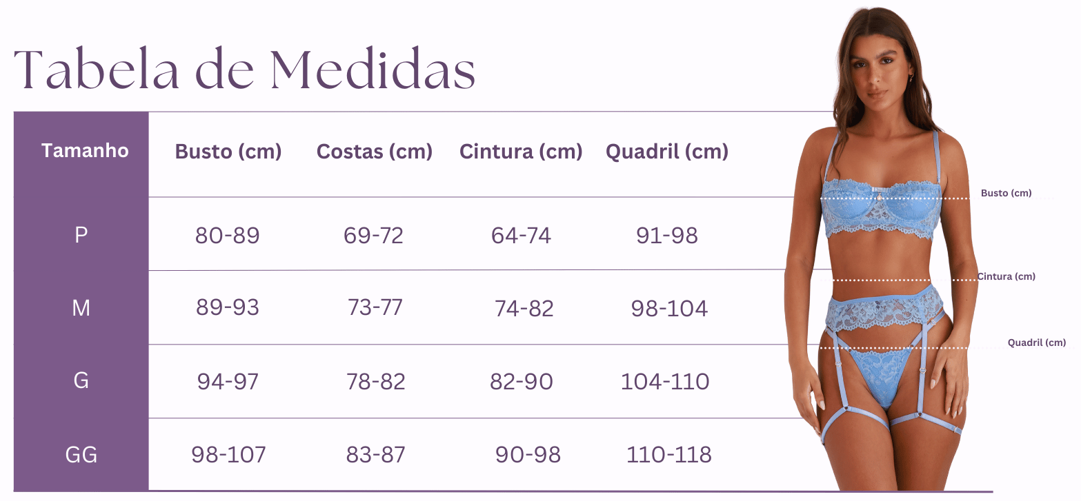 Os tamanhos informados são aproximados, pois os tecidos como renda possuem elasticidade. Se estiver entre dois tamanhos, recomendamos optar pelo maior para garantir mais conforto e melhor caimento.