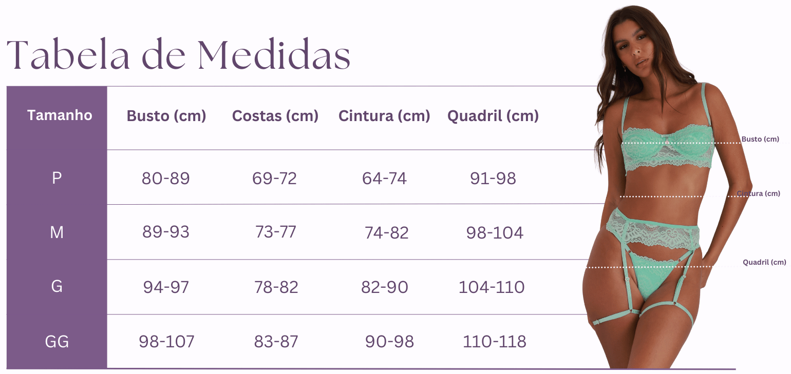 Os tamanhos informados são aproximados, pois os tecidos como renda possuem elasticidade. Se estiver entre dois tamanhos, recomendamos optar pelo maior para garantir mais conforto e melhor caimento.
